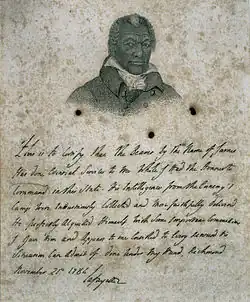 Although Virginia enacted a manumission act in 1782 allowing for the freedom of any slave who had fought in the Revolutionary War, James Armistead remained the property of William Armistead.[8] This was because the next year (1783) another law specifically freed only slaves who had been issued firearms (i.e. whose owners had used them as substitutes for army service). James had served as a spy, not a soldier, and did not carry a gun. Thus his first petition for emancipation was not passed even by a legislative committee before the session ended.[3] However, James persisted and succeeded with the support of William Armistead – again in 1786 a member of the House of Delegates – and Lafayette's personal 1784 testimonial as to James's service.[9] On January 9, 1787, Virginia's governor signed James's petition, which both houses of the assembly had passed. Virginia later compensated Armistead for James' manumission. Upon receiving his freedom, James added "Lafayette" (or "Fayette") as his surname to honor the French general.[3][7]