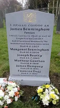 James Bermingham was a veteran of the 1867 Fenian Rising. As a member of the Irish Republican Brotherhood he was present at the attack on the police barracks at Tallaght.[3] At the funeral of James Stephens the founder of the Irish Republican Brotherhood on 31 March 1901, James Bermingham was one of the pall bearers along with Michael Davitt, C. G. Doran, Michael Lambert, William Brophy and William Hickey – all '67 veterans.[4]