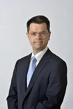 James Peter Brokenshire (8 January 1968 – 7 October 2021) was a British politician. A member of the Conservative Party, he served in Theresa May's cabinet as Secretary of State for Northern Ireland from 2016 to 2018 and then as Secretary of State for Housing, Communities and Local Government from 2018 to 2019. He also served as a minister at the Home Office under David Cameron and Boris Johnson. Brokenshire was Member of Parliament (MP) for Hornchurch from 2005 to 2010, and for Old Bexley and Sidcup from 2010 until his death in 2021.