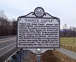 According to local tradition and folklore, Caudy is known as an "Indian fighter".[1][13][14] Upon detecting a Native American stalker in pursuit of him, Caudy pretended to flee along a pathway leading up the mountain toward the craggy bluffs spanning between 450 and 600 feet (140 and 180 m) above the Cacapon River, south of present-day Forks of Cacapon.[1][14][15] This pathway edged around the face of a rock formation overlooking the Cacapon River, and narrowed into a rocky ledge.[15][16] Another legend says Caudy was leading a group of pioneer settlers in defense against Native American attacks.[2][14]