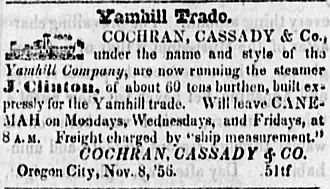 On November 8, 1856, Cochran, Cassady & Company, the owners of James Clinton, doing business as the Yamhill Company, placed the steamer on a schedule running to the Yamhill River from Canemah, departing every Monday, Wednesday, and Friday.[6]