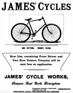 In 1884,[1] Harold "Harry" James founded The James Cycle Company in Birmingham to manufacture bicycles. The first works were at 121 Constitution Hill. In 1890, the company relocated to a new factory at Sampson Road North in Sparkbrook. James Cycle was converted to a public limited company in May 1897. Harry James retired in 1898, and his partner Charles Hyde took over. Hyde introduced a freewheel mechanism that proved very popular.[2]