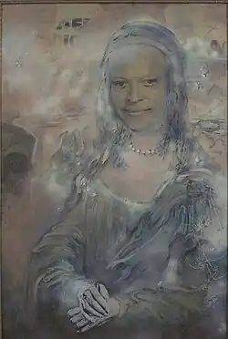 Walker's painting—probably his most famous and controversial work—caused a media stir. It was a satirical portrait of President Dwight D. Eisenhower in drag with a Mona Lisa smile.