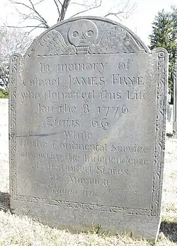 A week later, Colonel Frye died on January 8, 1776 as a result of wounds suffered at the battle of Bunker Hill and the resulting infection. He is buried at Old North Parish Burying Ground, in North Andover, Essex County, Massachusetts. His grave headstone reads: "IN MEMORY OF COLONEL JAMES FRYE, WHO DEPARTED THIS LIFE JAN THE 8TH 1776... WHILE IN THE CONTINENTAL SERVICE SUPPORTING THE INDEPENDENCE OF THE UNITED STATES OF AMERICA"[9]
