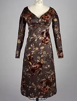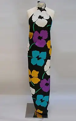 In 1952, James Galanos opened his own company, Galanos Originals, which was immediately ordered by Saks Fifth Avenue and Neiman Marcus in Beverly Hills.[6] He then opened his New York showroom where a Neiman Marcus clothing buyer discovered him and predicted his styles would soon "set the world on fire." Stanley Marcus, the president of Neiman Marcus, agreed and soon proclaimed that the greatest and most treasured luxury in the world for a woman to have would be a dress by James Galanos.[11] Legendary magazine editors and style arbiters such as Diana Vreeland, Eleanor Lambert, Gloria Vanderbilt, and Eugenia Sheppard became fans, ensuring that he would become a household name within months.[12][10] From this first collection, his clothing has been admired for its particularly high quality, especially considering it was ready-to-wear, not custom-made. His chiffon dresses, in particular, made his reputation in the early 1950s, with their yards of meticulously hand-rolled edges. Many designers worked with chiffon, but Galanos was a true master of the genre. He draped chiffon, pleated it, layered it, used flower prints and fabrics with metallic glints. As tailored as a shirtwaist dress or as seductive as a sarong, he gave chiffon a high style all his own. Sometimes he even gilded it, as in his notable pin-striped dress with a three-dimensional jeweled butterfly embroidered on the chest.[13]