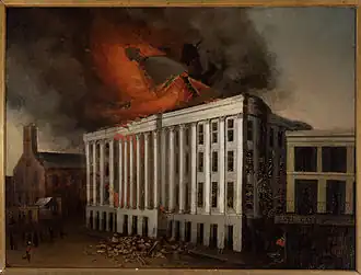 Arriving in the US in New York, Gallier formed a brief partnership with his exact contemporary Minard Lafever (1798–1854), and published The American Builder's General Price Book and Estimator (1833).[6] From Lafever undoubtedly Gallier met the brothers Charles (1811–1839) and James Dakin (1806–1852), who were then working for the prominent New York architects Ithiel Town and Alexander Jackson Davis. Town & Davis employed Gallier (then still called Gallagher) for four months in 1834 for the wage of $2.00 a day.[7] Town and Davis, and James Dakin on his own in 1834, were in the midst of designing some of the most distinguished Greek Revival buildings in the United States at the time, including the Bank of Louisville in Kentucky (1834), as well as the First Presbyterian Church in Troy, New York (1835).
