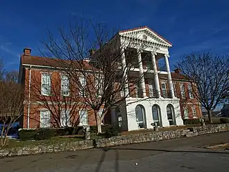 The center portion of the building is three stories, with a gable roof running front-to-back. The main entrance is inside an enclosed lobby of white painted brick which features three windowed arches on the front and arches with glass doors on either side. Above the lobby is a two-story pedimented portico, supported by four Ionic columns, with a third-floor balcony. On either side of the main block, set back from the portico, are 2 four-bay, two-story wings. Windows on the first floor façade are six-over-six sashes, while the second and third floors are nine-over-nine. The roof is covered in red tile with a decorative finial on the gable ends. The cornice is decorated with small dentils on the wings, and larger ones on the architrave.[4]