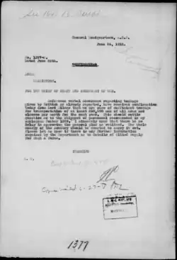 During a Supreme War Council meeting in Versailles on March 28, President Wilson shifted his position on American ground forces by allowing the temporary duty of AEF combat units in the British and French ranks (Joint Note #18). This was confirmed in, "The London Agreement" of April 27.[25][26][27] However, at the next Supreme War Council meeting in Abbeville, held a month later, other troops were allowed, and Pershing held that the latest agreement was in force.[28] This brought rebuke and a letter from Prime Minister Clemenceau to President Wilson.[28] In a follow-up conversation between Lord Reading, the British ambassador to the United States, and Harbord, the ambassador said the British would be willing to supply the transportation of 120,000 American infantry and machine gun unit personnel to France, if the United States could supply the men.[29] Harbord says the statement was like, "the sun breaking through the clouds" because, "If Great Britain can give us the ships to carry infantry alone, she could not refuse to carry troops from any other arm of the service. Accordingly, I said to him, 'Give me the ships, and I will furnish 120,000 men a month.'" When the ships arrived, the ship captains were instructed to accept only infantry and machine gun units. When Lord Reading found out that complete divisions were assembling, he was furious. When he was told that he must have misunderstood his conversation with Harbord, it looked like a conspiracy was in the works by the American generals. As a result of this, in May 1918, General Pershing transferred out much of his staff who he said, 'were too complacent about themselves, and how things are run around here'. The first to go was Harbord, who was sent forward to the trenches to command troops in battle.[30] However, due to Harbord's decision, the American position prevailed,[31][32][33][34] and full American divisions kept coming, so much so that by the time of the Armistice, the AEF. was two million men strong, two full American armies were formed, and a third was ready and deployed to the Rhineland in January 1919. In all, 40 complete divisions had arrived, 30 were fielded, and 10 were under temporary British control.[35] A complete list of A.E.F. divisions can be found here.