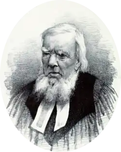 There were others besides the Senatus Academicus of Glasgow who felt it an honour to themselves to honour the face of the old man. Thomas Guthrie and his son, the minister of Liberton Free Church, paid a visit to Dr Ingram in 1871, and greatly cheered the heart of their venerable friend by their genial company and conversation. On his return to Edinburgh, Dr Guthrie set about the raising of a subscription for a portrait of Dr Ingram, and Mr Otto Leyde went to the Free Church Manse of Unst to execute the commission assigned to him. He succeeded in producing a characteristic likeness, life size, and the portrait having been presented to the Free Church, once adorned the walls of the Common Hall of the New College, Edinburgh. A smaller replica of this canvas was taken by the artist, and, along with a silver tea service, was presented to Dr Ingram, to be preserved as an heir-loom in the family.[1][9]