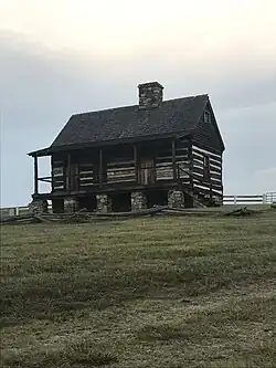 The cabin was built by Samuel Black. The cabin originally sat adjacent to U.S. Route 250 at the front of the Seven Oaks property, the building's original site. In 1978, the tavern was moved away from the road further into the Seven Oaks property. The tavern was dismantled and moved again to Mirador Farm in 2001. The single story and garret, v-notched log building has the basic form and appearance it had attained by 1930. Most of the wall logs are original, and other construction materials are older materials reused from other contexts. The building features a wood-shingled gable roof, a granite foundation and interior chimney, a front porch on skinned cedar log posts, and six-over-six windows. The interior is divided into two rooms by a log partition and the stone chimney, which includes two fireplaces and a bread warmer. Other interior features include exposed log walls, batten doors on strap hinges, hewn ceiling joists, and pegged floor boards.[4]