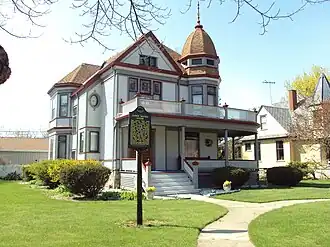 One side of the house has a large four-sided bay, located in the center of the facade and extending from to the roofline. The other side has a similar by, but round rather than four-sided. This bay is topped with a decorative metal frieze with a large dormer above. A small side entry and porch are also located on the side.[2]