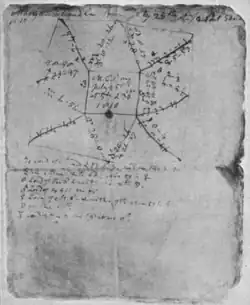 In south-east Essex, Murrell was known as "The Devil's Master",[9] a title that he himself used as a self-description.[10] He cultivated an air of mystery about himself by keeping himself largely apart from wider community life, speaking seldom, and traveling largely at night.[11] His house was locally known as a "place to avoid" and those visiting him reportedly often waited for some time outside, plucking up the courage to enter.[11] Within the cottage, Murrell had drying herbs hanging from his ceiling,[12] and his devices were reported to include a crystal, a mirror, and a bowl of water.[11] Other items that Murrell used in his magical practices were a copper charm with which he would allegedly distinguish whether an individual was lying or not, and a "trick" telescope that supposedly enabled him "to see through brick walls".[11] The latter device was examined by an acquaintance of Murrell's, who deemed it to be "a clumsily home-made arrangement of bits of looking-glass, such as might once have been bought at a toy-shop".[13] Murrell possessed a library of books, including works on astrology and astronomy, conjuration, and medical texts.[14] He also wrote a number of personal notebooks containing information on such topics, the last of which survived into at least the 1950s.[15]