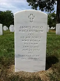 The family eventually returned to the U.S. in 1979[73] and settled on a farm in Mansfield, Louisiana.[83] Hagerstrom maintained his love of flying, and in 1992 planned to buy an ultralight aircraft.[6] He died of stomach cancer on June 25, 1994,[83] in nearby Shreveport.[84] Hagerstrom was survived by his wife and six of his children;[85] on July 26 he was buried with full military honors at Arlington National Cemetery.[83]