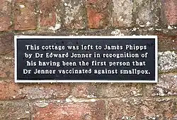 Later in Phipps's life, Jenner gave him, his wife, and his two children a free lease on a cottage in Berkeley, which went on to house the Edward Jenner Museum between 1968 and 1982.[7] Phipps attended Jenner's funeral on 3 February 1823.[13]