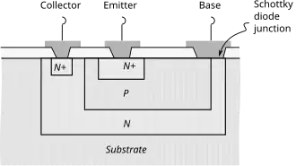 On December 31, 1964, Biard filed a patent for the Schottky transistor (U.S. Patent US3463975), a.k.a. the Schottky-clamped transistor, which consisted of a transistor and an internal metal-semiconductor Schottky-barrier diode.[17] The patent was filed based on Schottky Clamped DTL monolithic integrated logic circuits using aluminum-silicon Schottky diodes across the collector-base junctions of the transistors and in the input to adjust the logic levels. The diode prevented the transistor from saturating by minimizing the forward bias on the collector-base transistor junction, thus reducing the minority carrier injection to a negligible amount. The Schottky diode could be integrated on the same die, it had a compact layout, it had no minority carrier charge storage, and it was faster than a conventional junction diode. Biard's patent was filed before Transistor–transistor logic (TTL) circuits had been invented, yet it was written broadly enough to cover the Schottky clamped TTL ICs using platinum silicide Schottky diodes, which were much more predictable and manufacturable than the aluminum Schottky diodes he originally used. His patent ultimately improved the switching speed of saturated logic designs, such as the Schottky-TTL, at a low cost. In 1985, Biard received the Patrick E. Haggerty Innovation Award for this patent.