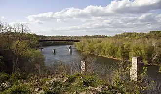 The James Rumsey Monument and surrounding park are located off Mill Street at the end of Rumsey Monument Road, within the eastern area of the corporation of Shepherdstown in Jefferson County, West Virginia.[1][3][5] The site consists of a granite column monument atop a plinth, and a small adjacent park.[6][7] It is situated atop a promontory overlooking the Potomac River at an elevation of 394 ft (120 m).[1][2][5] The monument and park are surrounded by forested land.[1][5] The platform around the monument's column provides a panoramic view of the Potomac River, the Chesapeake and Ohio Canal, the surrounding Potomac Valley, and the Blue Ridge Mountains.[7][8][9]