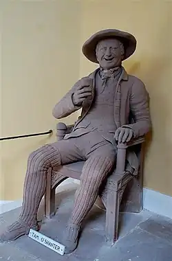 While engaged upon a monument in Crosbie churchyard, near Monkton, in 1827, he attracted the attention of David Auld, a hairdresser in Ayr. Encouraged by Auld, he carved a bust of Burns from a portrait — a copy of the portrait by Alexander Nasmyth — which hung in the Burns Monument at Alloway. It confirmed Auld's opinion of Thom's ability, and induced him to advise the sculptor to attempt something more ambitious. It was decided to create statues of Tam O'Shanter and Souter Johnnie, characters from Burns's poem Tam o' Shanter; Thom, who resided with Auld, set to work on the life-size figures, which were hewn direct from the stone without a preliminary sketch. William Brown, tenant of Trabboch Mill, served as model for Tam; no one could be induced to sit for the Souter, whose face and figure were surreptitiously studied from two cobblers in the neighbourhood of Ayr.[1]