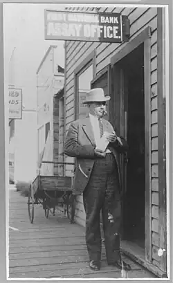 When Wickersham set off for Alaska he was allegedly dodging a government posting in Japan, and he told anyone who asked that he preferred the Eagle post, saying he "yearned for the Yukon, not Yokohama".[3] With the introduction of federal oversight Wickersham was one of three federally appointed judges. The other two were Arthur H. Noyes in Nome and the previously established Melville C. Brown in Juneau. This post made him one of the three most powerful people in Alaska, with no one within 3,000 miles to overrule his decisions or stand in his way. Wickersham was tasked with "cleaning up" the legal system after the Nome Gold Conspiracy which involved prominent Republican National Committee member Alexander McKenzie, and Judge Noyes.[4] His start into Alaskan official law involved litigation of that reflected the Alaskan frontier spirit. "Chief Charley, head of the Charley River band of the Tena Indians, was the first litigant to appeal to the new court officials for justice."[3] According to court records, someone from upriver had stolen his dog, considered a very serious offense at the time. After being given the run around, Chief Charley reached Wickersham and consulted the highest court in the land. Wickersham appointed a deputy to retrieve the stolen animal and waited with the chief for his return, chatting about everyday problems.[3] This incident helped frame Wickersham's reputation as a "man of action."