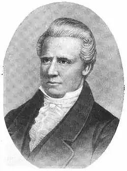 Jamestown is named after James Prendergast, an early Chautauqua County settler.[5] His family purchased 3,500 acres (14 km2) in 1806 in the area now known as Chautauqua County. James Prendergast explored the area that is now Jamestown. and saw the area to be valuable, and so he purchased an additional 1,000 acres (4.0 km2) of land in the area in 1808. In the fall of 1809, Prendergast and an employee, John Blowers, built a log cabin, which became the first building in Jamestown. Another log cabin, as well as mills and a dam, were built on the Chadakoin River later on.[6] In 1855, a night watch was created for the purpose of looking out for fires.[7]