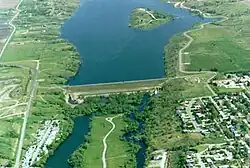 The Jamestown Dam[2] is a rolled-earth dam spanning the James River in Stutsman County in the U.S. state of North Dakota, serving the primary purpose of flood control. It is north of the city of Jamestown, North Dakota.[3] Built from April 1952 to September 1953, the dam measures 1,418 feet (432 m) long at the crest and 85 feet (26 m) high. It impounds the James River to form the Jamestown Reservoir. A small islet lies shortly upstream of the dam, where the James River previously split into two channels.