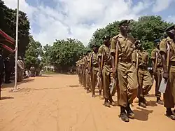 The Trooping of the Colour of the Kenya Defence Forces takes place every Jamhuri Day. The ceremony begins at 11:30 after the President of Kenya, takes the national salute, and inspects the parade. The band plays a slow march followed with a quick march the lone drummer then breaks away to take his position beside number one guard to play the drummers call, signaling the officers of No.1 Guard to take positions to receive the colour. The escort for the colour then marches off to collect the colour as the massed KDF band plays the chosen Kenyan tune. After the hand over and as the Escort presents arms the first verse of the Kenya national anthem is played, then the escort to the colour marches off in a slow march to the tune of the British grenadier guards. The first tune normally played during the march is always 'By land and sea'.[2][3] The parade concludes by marching to the tune of 'Kenya Daima' as the tri-service parade exits.