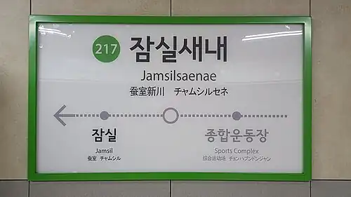 Jamsilsaenae Station (Korean: 잠실새내역) is a station on Seoul Subway Line 2, located in Jamsil-dong, Songpa District, Seoul. On December 15, 2016, it was decided to change the name Sincheon to Jamsilsaenae, to avoid confusion with Sinchon Station on the opposite end of the line.[2][3] Saenae (새내) is the native Korean pronunciation of the Sino-Korean Sincheon (新川), meaning "new stream".
