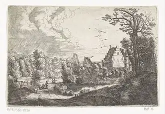 Bonnecroy was also a skilled etcher. The British Museum holds seven of his etchings which were formerly attributed to his master Lucas van Uden. The prints all depict landscapes with figures and were published by the Antwerp publisher Frans van den Wyngaerde, together with an eight print by Lucas van Uden.[7]