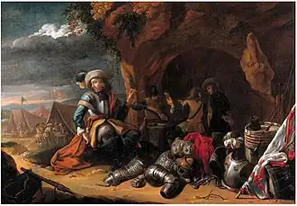 He was specialized in 'guardroom scenes', a type of genre scene that had become popular in the mid-17th century, particularly in the Dutch Republic. In Flanders there were also a few practitioners of the genre including David Teniers the Younger, Abraham Teniers, Tijssens' master Anton Goubau, Cornelis Mahu and Gillis van Tilborch. A guard room scene typically depicts an interior scene with officers and soldiers engaged in merrymaking. Guardroom scenes often included mercenaries and prostitutes dividing booty, harassing captives or indulging in other forms of reprehensible activities.[7] Tilborch painted a Guardroom Interior with Armour and a Standard Behind (sold at Sotheby's on 10 July 2004 in London, lot 172), which depicts two soldiers and a woman drinking and smoking in a room. The soldiers are almost completely hidden behind a pile of weapons and a war standard. In its general arrangement and specific details such as the figures and the armour on the floor the painting is based on the signed composition of Tijssens' master Anton Goubau in the National Gallery in Prague. The Goubau painting continues to the left into a horizontal composition. It is likely that Tijssens' painting was cut down as on the extreme left margin the nose, moustache and chin of the figure next to the woman are visible. The original painting may therefore have been similar in composition to that of Goubau.[8] The armour depicted in the picture was already out of date at the time it was painted since metal armours, breast plates and helmets fell out of use from the 1620s.[9] It is possible that in line with the moralizing intent of the genre, the armour is a reference to the vanitas motif of the transience of power and fame.[10]