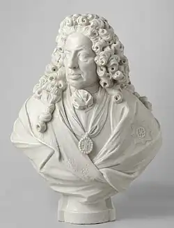 Xavery made several bust portraits. One impressive work is the marble bust of Don Luis da Cunha, ambassador of Portugal (1737, Rijksmuseum). Don Luis da Cunha (1662–1749) was ambassador to the kingdom of Portugal between 1728 and 1736. The bust shows the ambassador as a stately figure wearing a cuirass and cloak. Even though the sitter was already 75 years old at the time of the bust, Xavery gave him a vital face. This was likely the result of the artist not dwelling on the details in the face and clothing of the ambassador. Xavery made bust portraits of other prominent personalities such as William VIII, Landgrave of Hesse-Kassel, Frederick I of Sweden, the Duke of Marlborough and Prince Eugene of Savoy.[14] Xavery also made a portrait bust of François Fagel, an important personality who served as servant of the States General for more than sixty years.[3] His various funeral monuments also include busts or full-length portraits of the deceased persons. These include the funeral monuments of Johannes Graaf von Lilljenstedt (1732) in the Marienkirche in Stralsund, Johan Theodorus baron von Friesheim (1733) in the Grote of Sint-Catharinakerk in Heusden, Sicco van Goslinga (1737) in the Hervormde kerk in Dongjum and Count Oswald III van den Bergh (1741) in the Sint Petrusbasiliek in Boxmeer. Some of the funeral monuments such as that of Reinhart Vincent von Hompesch in Linnich have been lost while of that of Johan van Welderen only the bust portrait has survived.[5]