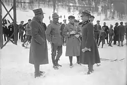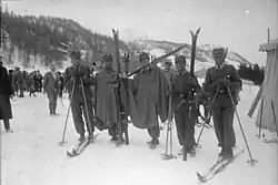 At the 1928 Winter Olympics, in St. Moritz, Switzerland, a military patrol competition was held. Because of a snowstorm the night before the competition, the start of the event was delayed 45 minutes to the cleaning up of the track. The competition was contested over a 30 km (19 mi) distance with an elevation difference of 1,100 m (3,600 ft). The starting point was on a height of 2,108 m (6,916 ft), the highest point at 2,877 m (9,439 ft), and the goal in the valley at 1,850 m (6,070 ft).[1] Nine countries with 36 military patrol runners participated in this event.