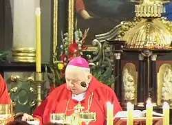 In 1988, Father Szlaga was named Auxiliary Bishop of Chelmno and Titular Bishop of Mascula.[2] In 1992 he was consecrated as Bishop of Pelplin. While serving as Bishop he received Commander's Cross of the Order of Polish Rebirth.[3] He was named an honorary citizen of Chojnice (1994), Starogard Gdański (2007) and Gdynia (2008),[4] and received the 2010 Award For Services to Pomerania.[5]