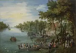 Like his father, Jan Brueghel also painted various village landscapes. He used the surrounding landscapes as the stage for the crowds of anecdotal, colourfully dressed peasants who engage in various activities in the market, the country roads and during the rowdy kermesses.[36] Jan Brueghel's landscape paintings with their strong narrative elements and attention to detail had a significant influence on Flemish and Dutch landscape artists in the second decade of the 17th century. His river views were certainly known to painters working in Haarlem, including Esaias van de Velde and Willem Buytewech, whom Brueghel may have met there when he accompanied Peter Paul Rubens on a diplomatic mission to the Dutch Republic in 1613.[38]