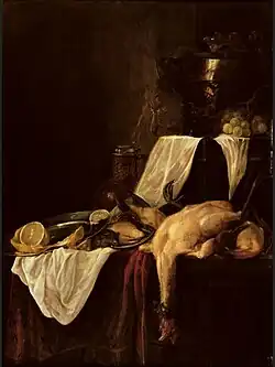 Jan Dirven was a still life painter of fish still lifes and banquet still lifes. His dated still lifes date from the 1640s.[5] With Pieter de Putter and Isaac van Duynen he belongs to "The Hague School" of still life painters and painted in the monochrome style preferred by these painters,[2]