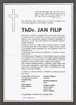 Jan Filip (born 9 December 1911 in Přibyslav; died 21 November 1971 in Kratonohy, near Hradec Králové) was a Czech priest, doctor of theology, professor, writer, Esperantist, and lexicographer.