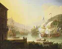 By 1685, there were four paintings by van Beecq in place at Louis XIV's new palace at Marly, the decoration of which was organised by Le Brun and Jules Hardouin Mansart. They are known to have included views of Algiers Bombarded by Night and The Cannonade of Chios. The latter, the only surviving painting by van Beecq of which a contemporary documentary record exists, is now in the collection of Musée de la Marine in Paris. The king also owned van Beecq's painting of the bombardment of Genoa by Admiral Dusquesne in 1684; two versions were painted, though neither is known today. Surviving correspondence shows that drawings by eyewitnesses of the bombardment were gathered by government officials as source material to supply to van Beecq, to ensure the accuracy of his representation.[3] A large engraving on two plates was made after the painting by Moyse Jean-Baptiste Fouard.[8]