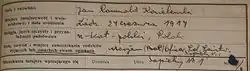Jan Karski was born Jan Romuald Kozielewski on 24 June 1914 in Łódź,[a] Poland.[1][4] Karski was born on St John's Day, and named Jan (the Polish equivalent of John), following the Polish custom of naming children after the saint(s) of their birthday. His baptismal record—in error—listed 24 April as his birthdate, as Karski explained later in interviews on several occasions (see Waldemar Piasecki's biography of Karski, One Life, as well as published interviews with his family).[1]