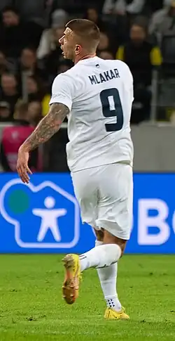 Mlakar was capped for Slovenia at all youth levels from under-15 to under-21.[22] He was the top goalscorer of the qualifications for the 2015 UEFA European Under-17 Championship, with eight goals.[2] In June 2019, Mlakar was included in the senior squad for the UEFA Euro 2020 qualifying match against Latvia,[23] but was an unused substitution.[24]