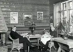 While Sibelius was studying music in Helsinki in the autumn of 1888, Armas Järnefelt, a friend from the Music Institute, invited him to the family home. There he met and immediately fell in love with Aino, the 17-year-old daughter of General Alexander Järnefelt, the governor of Vaasa, and Elisabeth Clodt von Jürgensburg, a Baltic aristocrat.[19] The wedding was held on 10 June 1892 at Maxmo. They spent their honeymoon in Karelia, the home of the Kalevala. It served as an inspiration for Sibelius's tone poem En saga, the Lemminkäinen legends and the Karelia Suite.[11] Their home, Ainola, was completed near Lake Tuusula, Järvenpää, in 1904. During the years at Ainola, they had six daughters: Eva, Ruth, Kirsti (who died aged one from typhoid),[30] Katarina, Margareta and Heidi.[31] Eva married an industrial heir, Arvi Paloheimo, and later became the CEO of the Paloheimo Corporation. Ruth Snellman (fi) was a prominent actress, Katarina Ilves married a banker and Heidi Blomstedt was a designer, wife of architect Aulis Blomstedt. Margareta married conductor Jussi Jalas, Aulis Blomstedt's brother.[32]