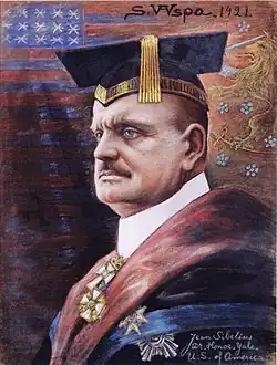 Sibelius's first significant composition of 1913 was the tone poem The Bard, which he conducted in March to a respectful audience in Helsinki. He went on to compose Luonnotar (Daughter of Nature) for soprano and orchestra. With a text from the Kalevala, it was first performed in Finnish in September 1913 by Aino Ackté (to whom it had been dedicated) at the music festival in Gloucester, England.[53][55] In early 1914, Sibelius spent a month in Berlin where he was particularly drawn to Arnold Schoenberg. Back in Finland, he began work on The Oceanides, which the American millionaire Carl Stoeckel had commissioned for the Norfolk Music Festival. After first composing the work in D-flat major, Sibelius undertook substantive revisions, presenting a D major version in Norfolk, which was well received, as were Finlandia and the Valse triste. Henry Krehbiel considered The Oceanides one of the most beautiful pieces of sea music ever composed, while The New York Times commented that Sibelius's music was the most notable contribution to the music festival. While in America, Sibelius received an honorary doctorate from Yale University and, almost simultaneously, one from the University of Helsinki where he was represented by Aino.[53]