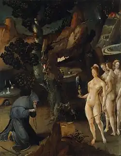 The records of the Guild of Saint Luke of Antwerp record the following pupils of Jan de Cock: a 'Loduwyck' in 1505 and a Wouter Key in 1516.[7] Jan Wellens de Cock was probably identical to the 'Jan de Cock' that worked as a servant to the guild of 'Onze-Lieve-Vrouw Lof' for which he executed many commissions over the next few years. In 1507 de Cock was paid for painting angels and restoring the Holy Ghost at the altar of this guild in Antwerp Cathedral. He also worked on commissions for the brotherhood of Onze-Lieve-Vrouw-Lof in Antwerp.[1] These works were probably lost in the iconoclastic destruction of mainly religious images and statues known as the beeldenstorm that raged in parts of the Low Countries in 1566. In 1511 the guild paid de Cock for cutting a woodblock for a print to use in the guild's procession.[8] This is the only indication that de Cock, to whom several prints have been attributed, was indeed active as a block cutter.