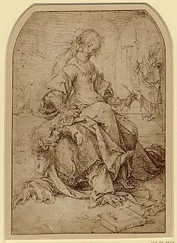 His drawings are principally preparatory studies for paintings, designs and cartoons for glass windows and works on canvas that served as a possible example for temporary decorations during festive occasions.[1]