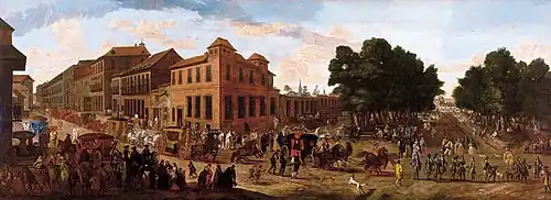 Antonio Palomino also mentioned that van Kessel was a skilled landscape artist. No work in this genre has been securely attributed to van Kessel.[1] A topographical view of a street in Madrid representing a View of the Carrera de San Jerónimo and the Paseo del Prado with a Procession of Carriages (Thyssen-Bornemisza Museum, Madrid) has tentatively been attributed to him.[14]