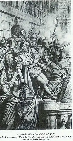 Van de Werve studied canon law, and followed his father in a career of service to the city of Antwerp, serving numerous terms as an alderman between 1533 and 1570.[1] During the Sack of Antwerp by Spanish mutineers from the Army of Flanders, Van de Werve tried to defend Antwerp City Hall form destruction. His was one of the 7,000 lives that were lost in the sack.