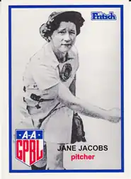 Jane Jacobs was not a hard thrower, but her underhand fastball fooled batters because she was basically a curveball pitcher. Jacobs hurled an in-curve, out-curve, upshoot and specially a drop ball, her better pitch. Her most impressive start was having pitched a complete game-shutout one-hitter, but she fell victim to sidearm delivery when the league converted to it.[2]