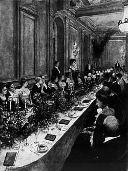 In 1909 Hogarth shifted from the Book Club to the offices of The Encyclopædia Britannica in High Holborn in central London, where she was placed in charge of the female indexers for the eleventh edition.[23][24][25] In addition to her supervision of the indexing, Hogarth also wrote and edited hundreds of unsigned articles for the finished work.[26] In December 1910 one of four dinners to celebrate the completion of the eleventh edition was held at the Savoy Hotel in honour of the women contributors to the encyclopædia. The keynote speech, replying to the toast "The work of women", was given by Janet Hogarth, during which she declared that The Encyclopædia Britannica "has given women the chance to demonstrate their rightful place in the learned world".[23][27] The eleventh edition of The Encyclopædia Britannica was published during 1910 and 1911, consisting of 28 volumes plus an index volume.[28]
