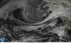 In late January 2021, an extratropical cyclone developed in the Northeastern Pacific Ocean, to the south of Alaska.[10][11] The system subsequently occluded and strengthened, reaching a peak intensity of 984 millibars (29.1 inHg) at 18:00 UTC on January 26, before gradually weakening, while slowly moving southeastward.[12][13] The system drew moisture northeastward from the North Central Pacific towards the West Coast of the United States in a phenomenon known as the Pineapple Express, an atmospheric river known to affect the West Coast of the United States for periods of time during the winter. The main focus of this plume of moisture was directed towards the state of California on January 26, bringing heavy amounts of rain and snow.[14][11] By 15:00 UTC, the Weather Prediction Center (WPC) began issuing storm summary bulletins for the storm, as it was impacting California.[15] On January 27, the storm began moving towards the West Coast, with the storm's trough and cold front reaching the coasts of Oregon and Northern California, channeling a large atmospheric river into California in the process,[16][11] triggering a Category 2 Atmospheric River event for California (based on a scaling system devised by the Scripps Institution of Oceanography that ranks atmospheric river events from 1 to 5).[11][17] The low-pressure system responsible slowly moved eastward near the coastline, prolonging impacts until it moved inland early on January 29, in a weakened state.[18] During this time, the storm's cold front and the atmospheric river gradually moved southward, reaching Southern California by 00:00 UTC on January 29, increasing the intensity of the precipitation in the southern part of the state.[11] The storm continued moving eastward towards the Rocky Mountains while weakening, and later on January 29, the WPC terminated storm summary bulletins for the storm over the West Coast, as impacts had generally diminished.[19]