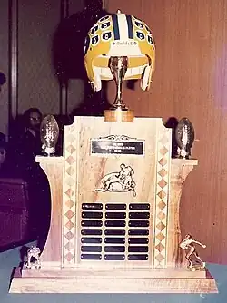 Following the 1977 appearance of Joe Roth – an All-American quarterback from Cal who was suffering from melanoma, which would lead to his death weeks after playing in the game – the game's MVP recognition was given as the Joe Roth Memorial Award.[24] The trophy is topped by Roth's helmet. The first recipient was Jimmy Cefalo of Penn State in 1978.[25]