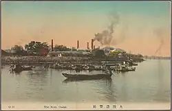 Amongst the first acts of the Meiji government was the establishment of the Imperial Japanese Mint as a constructive step towards modernising Japan's circulating currency. In the early Meiji era, paper currency was initially printed by Dondorf and Naumann in Germany.[1] The European production was inspected and sealed by Banknote Annex Office of the Ministry of Finance. A proposal to construct a banknote manufacturing plant was submitted to Grand Council of State in May 1874; and construction was approved in December of that same year. A two-story Western red brick building was completed in October 1876.[2]