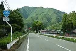 National Route 105 crosses Akita Prefecture in a southwest–northeast routing. Beginning at a junction with national routes 7 and 341 in the coastal city of Yurihonjō, it travels east alongside National Route 107 and National Route 108 through the central district of the city. After crossing over the Uetsu Main Line, the concurrent highways leave National Route 105, with National Route 108 exiting first, heading southwest towards Miyagi Prefecture. Shortly beyond that point, National Route 107 leaves continuing east towards Iwate Prefecture while National Route 105 turns to the north, paralleling the Uetsu Line. Eventually the highway curves to the east again, heading towards Daisen. Southwest of central Daisen, the highway turns to the north at a junction with the Akita Expressway. After passing through the city it enters the city of Semboku, though it passes to the west of the central district on its way towards Kitaakita. From the former village of Kakunodate in Semboku to the former town of Takanosu in Kitaakita, the highway is called the Matagi Road.[2] From southern Semboku to Kitaakita, the highway roughly parallels the Akita Nairiku Line. The highway terminates at a junction with National Route 7 to the north of central Kitaakita. It has a total length of 170.0 kilometers (105.6 mi).[1][3]