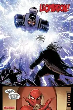During the "Spider-Geddon" storyline, Superior Spider-Man (Doctor Octopus' mind in a Proto-Clone body) and Spider-Man of Earth-1048 warn Takuya that the Inheritors have escaped. He talks with the alternate Spider-Men on how to defeat the Inheritors.[2] He allows Superior Spider-Man to analyze the Multiverse to find new recruits to help fight the Inheritors like a Spider-Cop and a Tyrannosaurus.[3] During the Spider-Army's attack on the Inheritors who are using the abandoned New U Technologies as a base, Takuya starts to have Leopardon transform until he is attacked by Daemos. When Miles Morales became the latest Captain Universe, he used Leopardon's sword to attack Solus, Brix, Bora, and Daemos.[4]